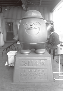羽生市には数社の鋳物工場があるが、同市の羽生小松台工業団地の㈱ハイキャストでは、鋳鉄の「ハイキャストン」が出迎えてくれるが、鋳放し肌で服を着ていなかった(塗装なし)。